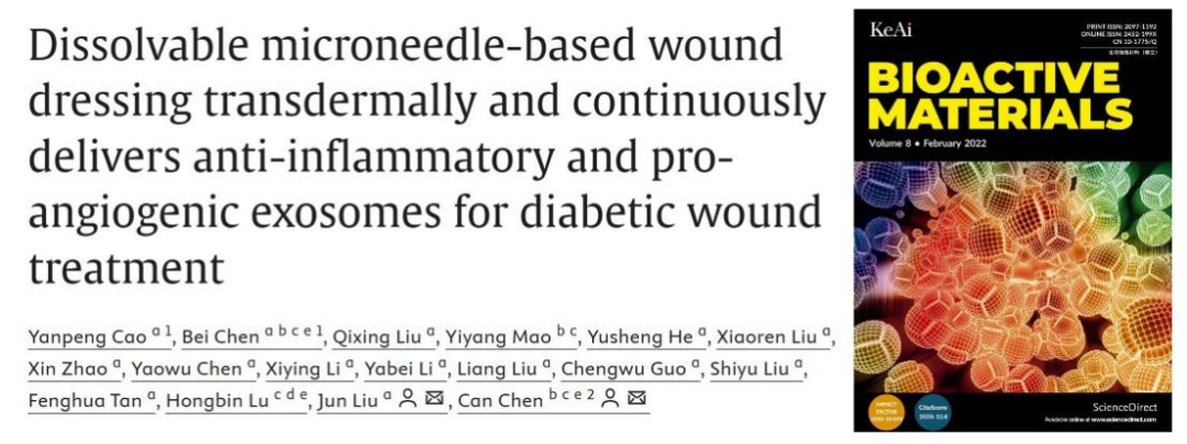 标题:Dissolvable microneedle-based wound dressing transdermally and continuously delivers anti-inflammatory and pro-angiogenic exosomes for diabetic wound treatment