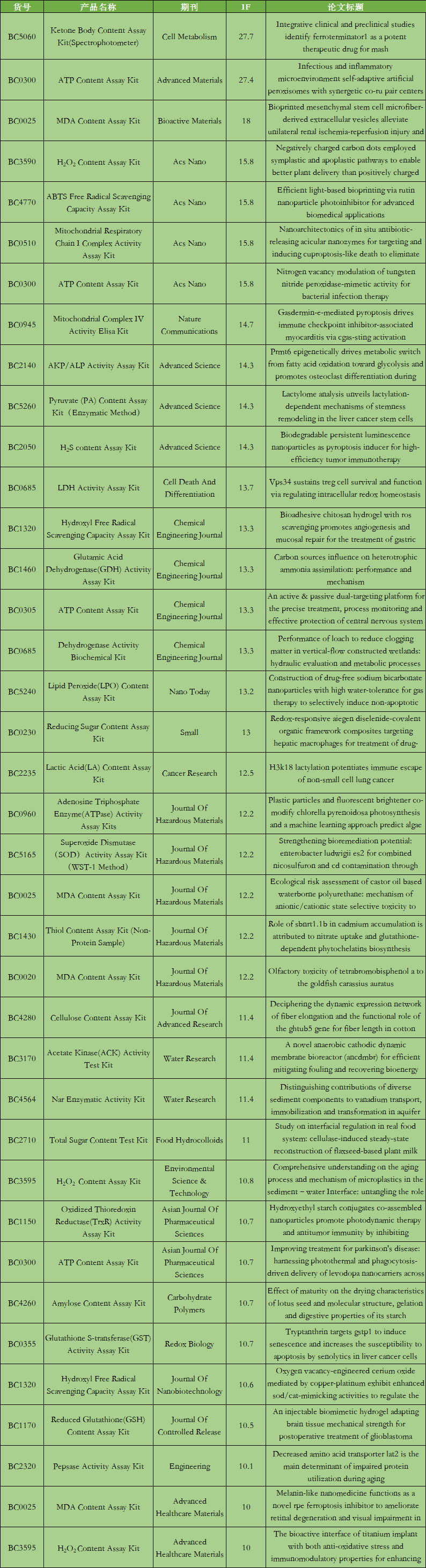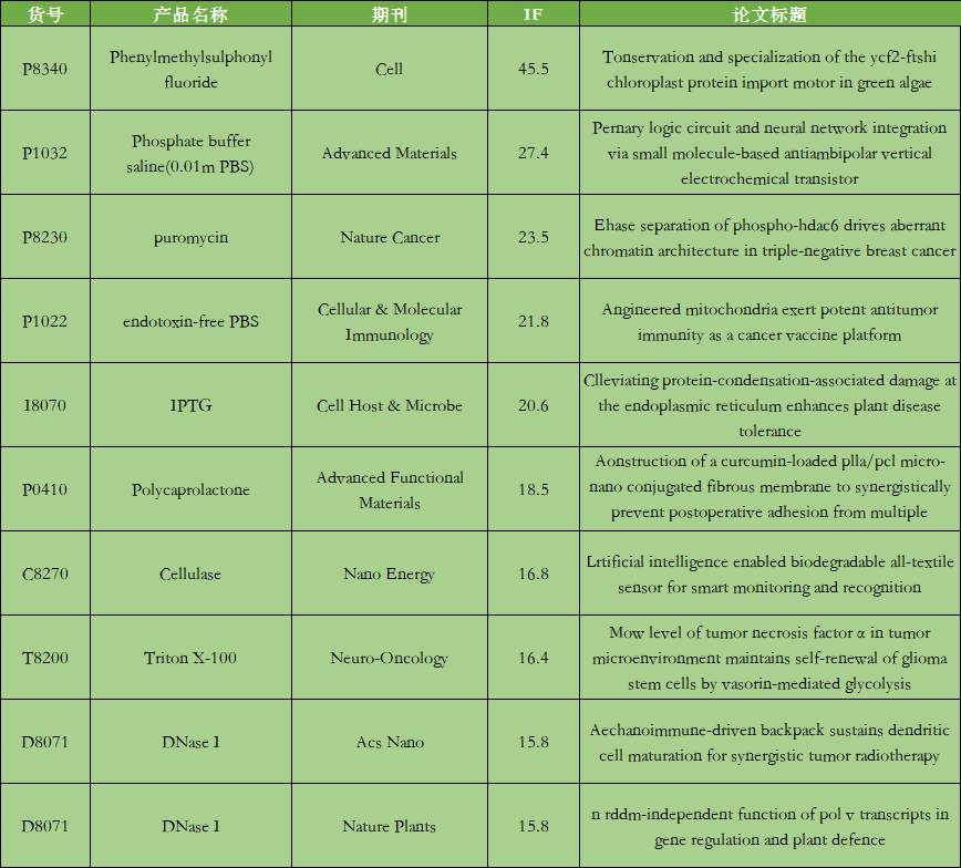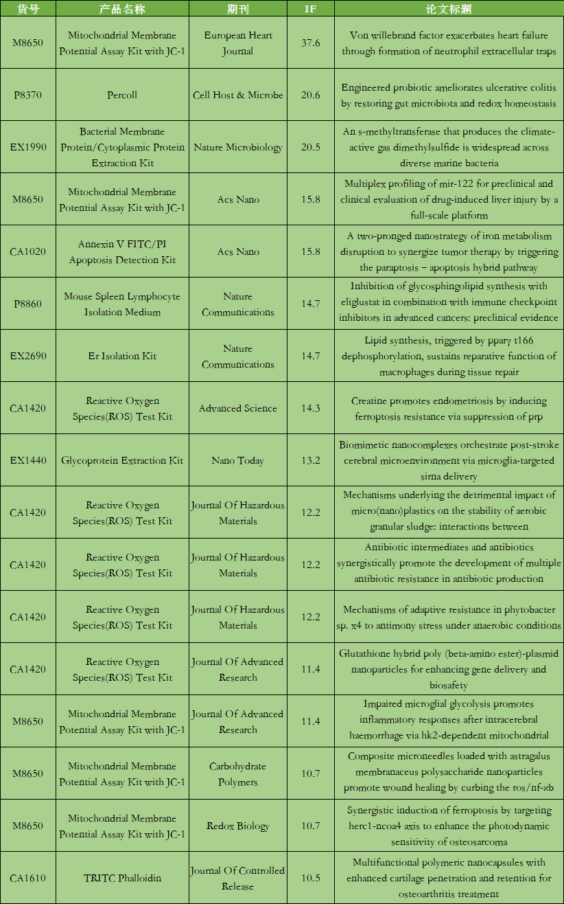 在本月中,单月引用文献达2258篇,单月引用产品数量达3086个;单月总影响因子为14225.3,最高影响因子高达45.5。单月影响因子20+的文献共有28篇,影响因子10+的文献更是多达343篇,较上月大幅度增加。这些数字不仅体现了广大科研人员累累硕果,更展现了Solarbio产品在科研中的广泛应用。
