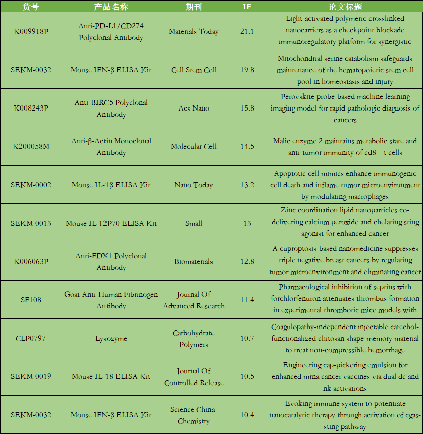 此外我们还节选了10篇IF超过18分的杰出文献,包含了多种产品:抗体、ELISA试剂盒、生化试剂盒、细胞检测试剂盒、细胞分离液、蛋白提取试剂盒、染色试剂与小分子化合物等,供各位小伙伴们参考。