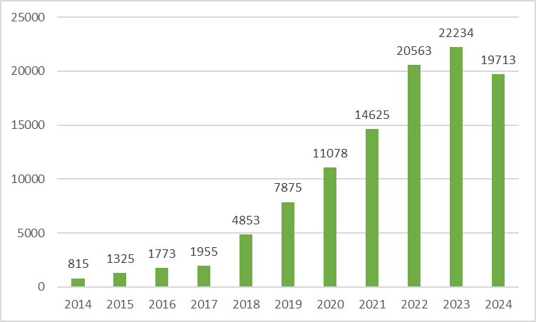 截至目前为止,全网共计收录引用Solarbio产品的文献达109129篇,总影响因子高达602152.85,最高IF高达82.9。这一数据的背后不仅彰显了科研工作者们在科研道路上不懈的追求与探索,更是对Solarbio产品的高度认可与信赖。下图分别为引用Solarbio产品近十年年度及2024年各月度SCI文献数量分布(截止目前)。